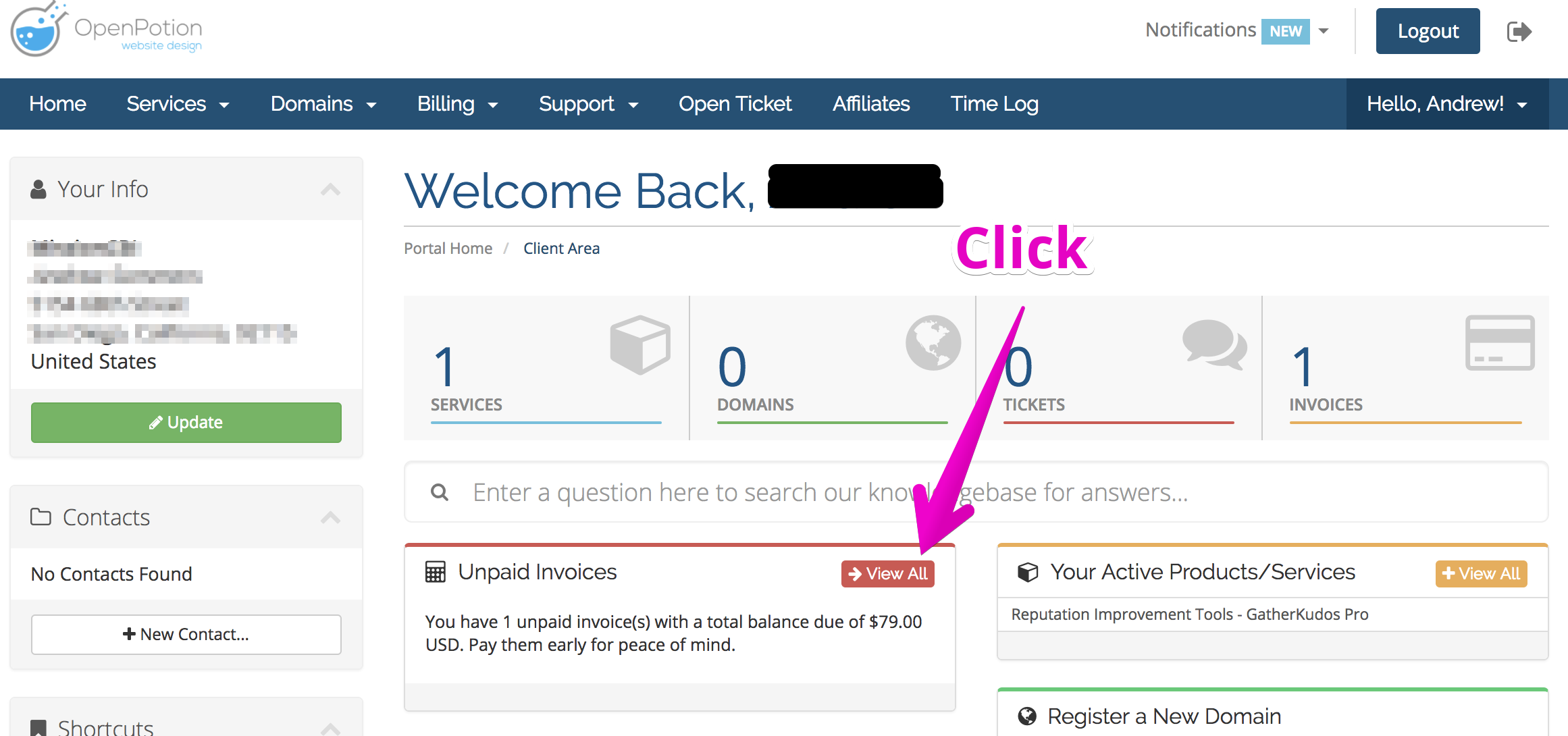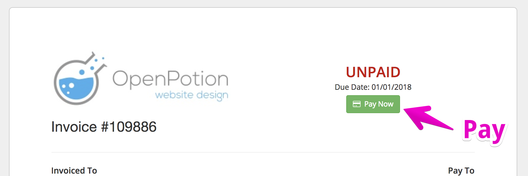 You can easily make payments online using your credit card by going to http://clients.openpotion.com and logging in. Most people will figure it out pretty easily, however here are step by step directions on how to pay your OpenPotion invoices.